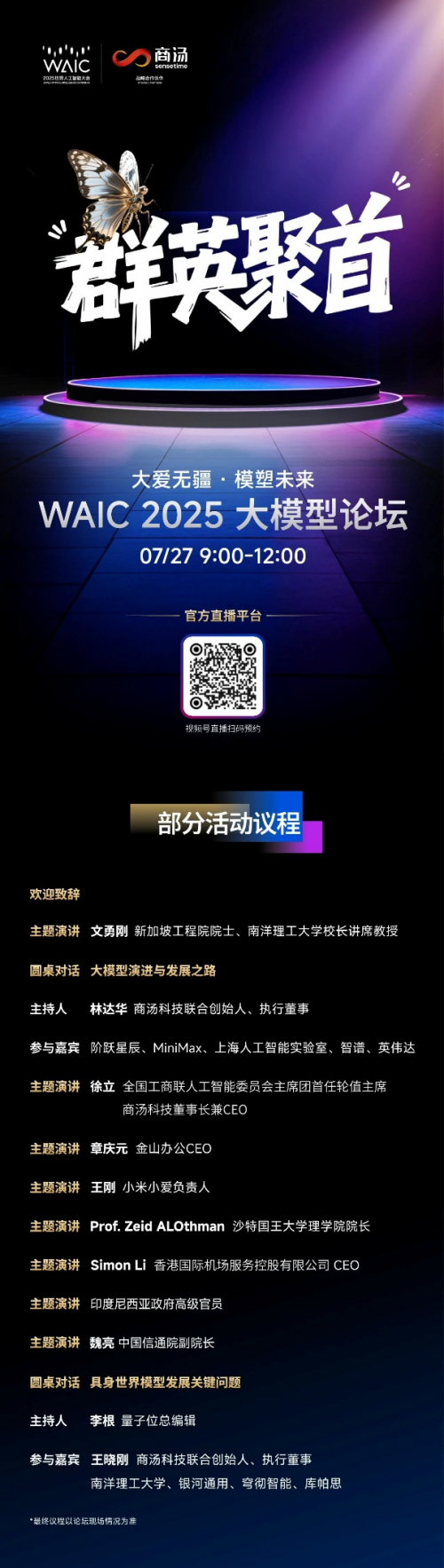 从对“模型之问”的深邃哲思,到推动大模型实践应用与生态落地的坚实步伐,7 月27日,【大爱无疆·模塑未来】WAIC 2025 大模型论坛,商汤科技邀您共赴盛会。