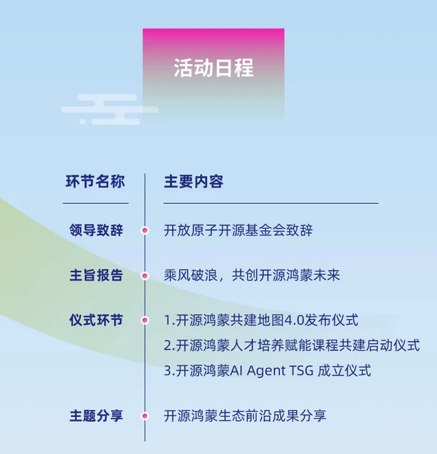 从技术成果展示到实战案例分享,从人才培养布局到AI创新融合,2025开放原子开源生态大会开源鸿蒙主题演讲将全方位呈现开源鸿蒙生态的“现在与未来”。无论您是技术开发者、企业决策者,还是开源生态关注者,7月23日下午北京国家会议中心二期会议室251,这场面向万物智联的开源盛宴都将为您解码技术趋势,链接生态资源,不容错过!