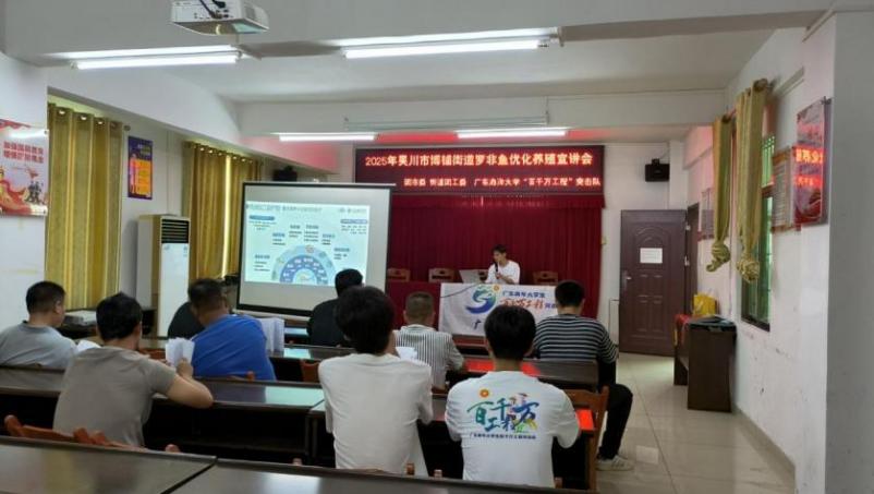 为将专业知识转化为实际生产力,突击队举办了罗非鱼副产物利用讲座。突击队成员刘浩在讲座中指出当前罗非鱼副产物资源浪费严重,提及罗非鱼副产物的巨大潜在价值,传授鱼副产物的分类利用方法,如提取肝素、生产富肽功能饲料、开发海洋阿胶食品等,并提供产品进行试用、试吃,为养殖户打开了除传统养殖外的增收思路。此外,突击队举办了罗非鱼优化养殖技术讲座。