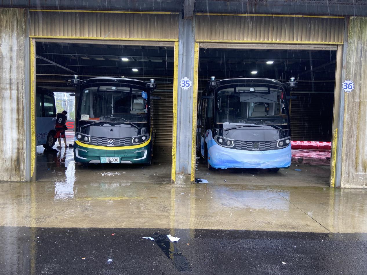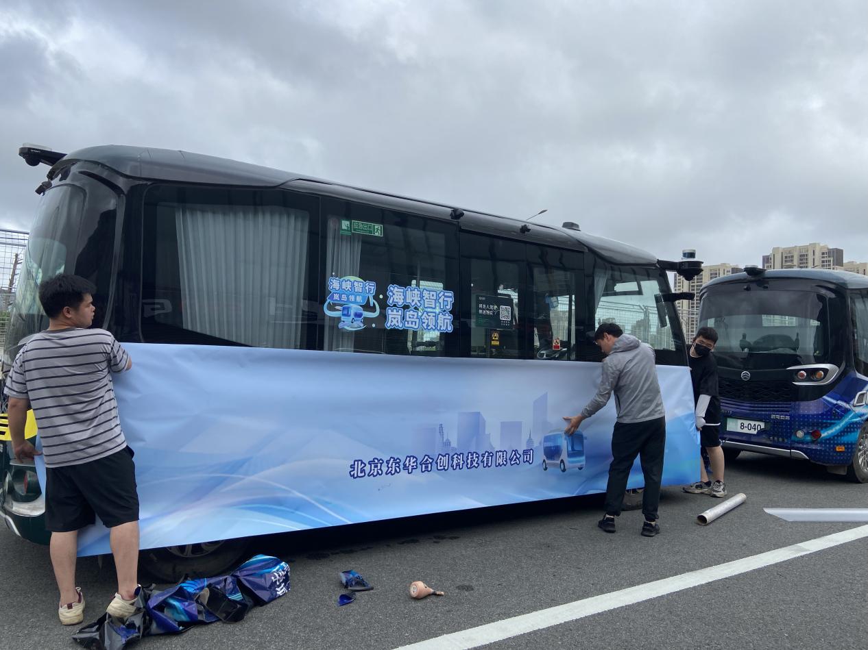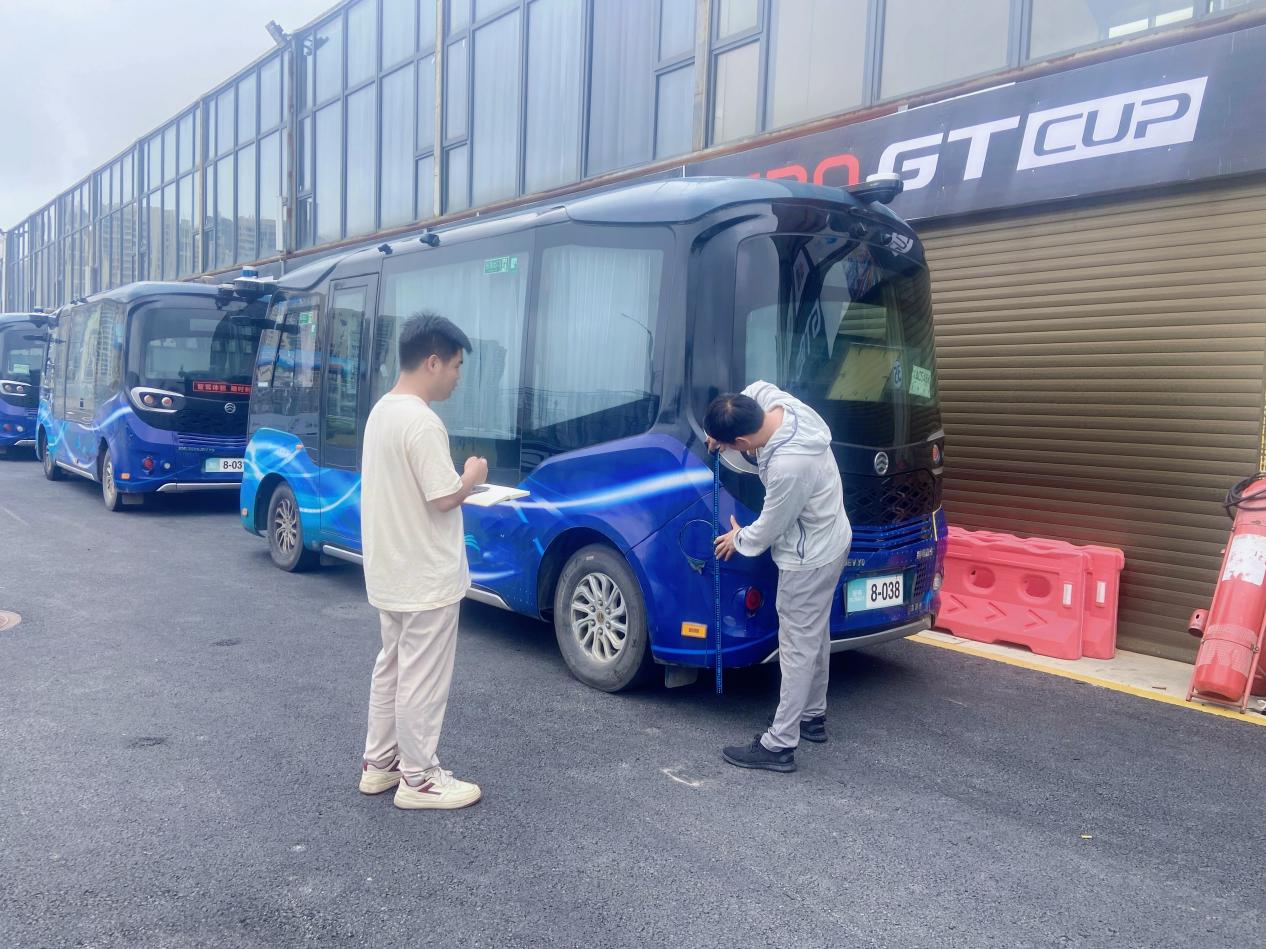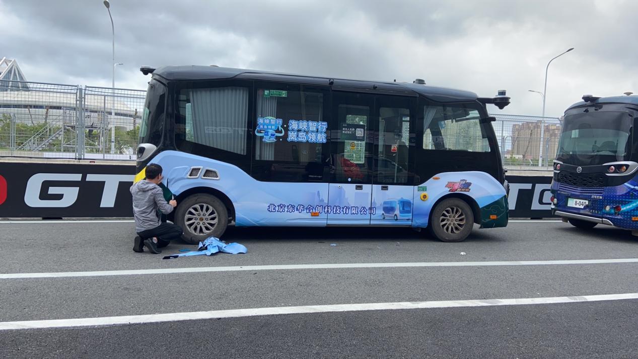 本次参赛团队的自动驾驶小巴已抵达平潭如意湖赛道!目前进行统一涂装设计,科技战驹整装待发。