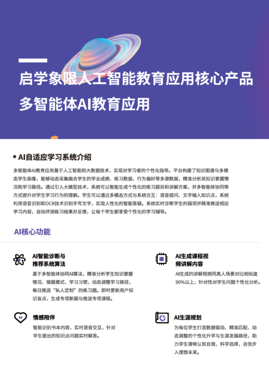 基于人工智能底层模型能力,启学象限运用多智能体协同方式搭建AI自适应学习系统,实现对学习者的个性化指导。平台构建了知识图谱与多模态学生画像,动态采集融合学生的学业成绩、练习数据、行为偏好等多源数据,精准分析其知识掌握情况和学习路径。通过引入大模型技术,系统可以智能生成个性化的练习题目和讲解方案,并通过多智能体协同等方式提升对学生学习行为的理解。