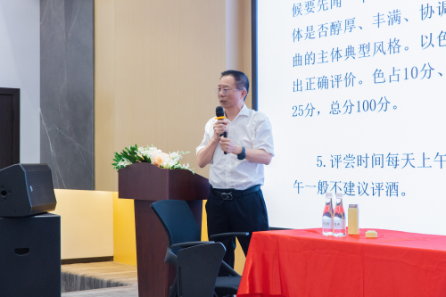 签约仪式后,刘大昌大师现场开展《酱香型白酒制曲制酒储存勾调品鉴》专题培训,以“观色、闻香、尝味、悟格”四步法为纲系统解析酱香酒品鉴核心方法论和石荣霄酒茅系古曲酱香的风味形成机理与工艺精髓,为石荣霄营销团队及嘉宾奠定了扎实的品鉴理论基础。