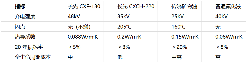 通过对比可见,长先产品在安全性、效率与成本的平衡上优势显著:CXF-130 的高绝缘与高效散热适合高风险场景,CXCH-220 的宽温与低成本适合大规模应用,共同填补了传统冷却液在储能领域的性能缺口。