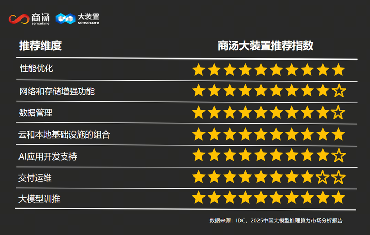 近日,IDC发布首个《2025中国大模型推理算力市场分析报告》。此次评估中,商汤大装置在“性能优化”“云和本地组合”“大模型训推”三大核心能力上获得满分,成为极少数在训推效率、开源生态与产业落地深度上均实现全面领先的AI基础设施之一,已跻身中国大模型推理算力厂商第一梯队。