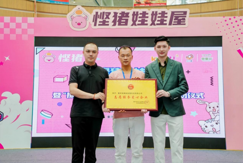 公益授牌环节上,重庆市阳光公益事业基金会阳光志愿者服务队大队长唐斌将“志愿服务爱心企业”牌匾授予重庆悭猪娃娃屋科技有限公司。悭猪控股集团董事徐浩深、黄浩峰代表企业接受荣誉。
