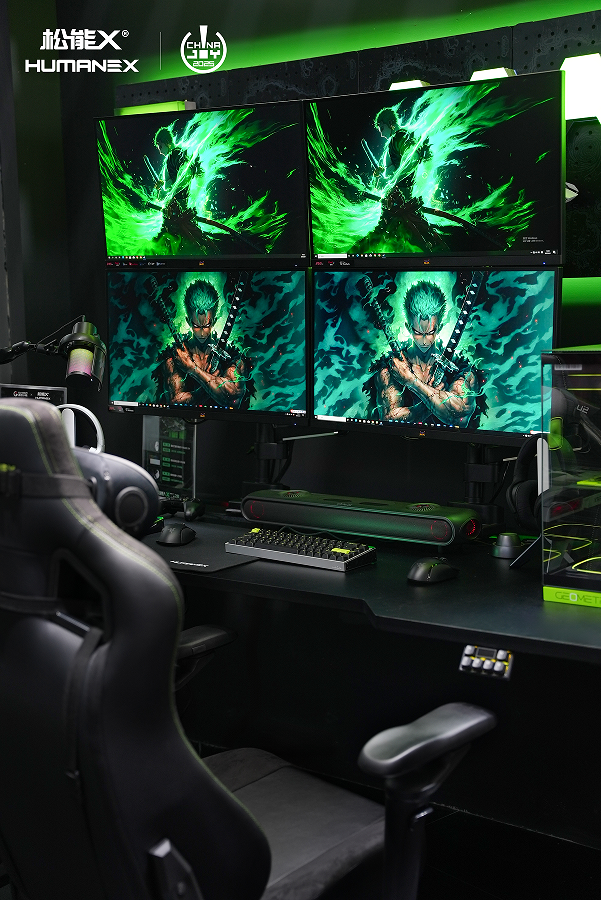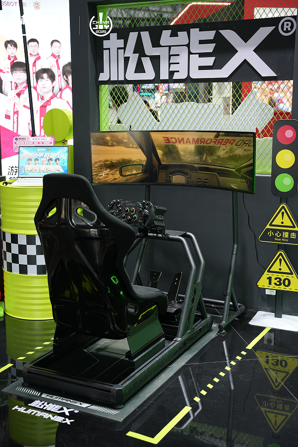 本届ChinaJoy现场,松能X围绕电子游戏空间核心场景,打造四屏对战区与赛车模拟区两大体验场景。四屏对战区采用X3电竞桌+TX02上下屏显示器支架方案,实现显示器多向自由调节。赛车模拟区则通过S6赛车模拟器整合魔爪驱基座、方向盘、脚踏套组,1:1还原《极限竞速:地平线5》赛道体验,为玩家带来专业级竞速沉浸感。
