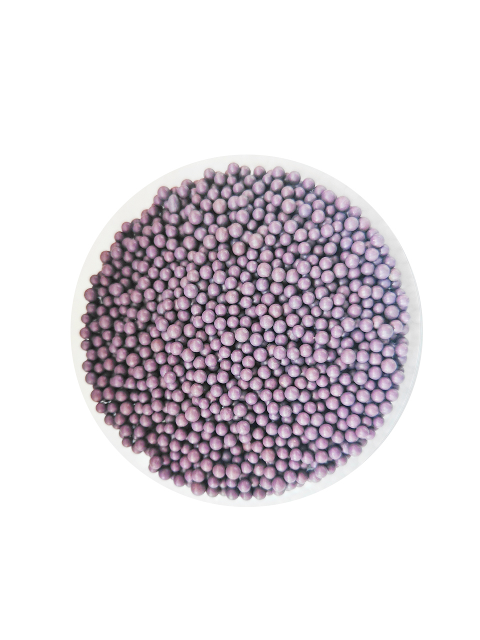 深加工后的奥德邦球衍生出高价值原料,其中“Audubon Ball-母料”是关键一环。该母料呈浅紫色颗粒状,粒径2-3mm,最大含水量20 wt%,具备高强度(>7 N)和高孔隙率(>35%,氮气吸附法)。其基材表面积达200 m²/g,堆积密度0.90 g/cc,除臭因子含量超过2wt%,适用于高效吸附系统。