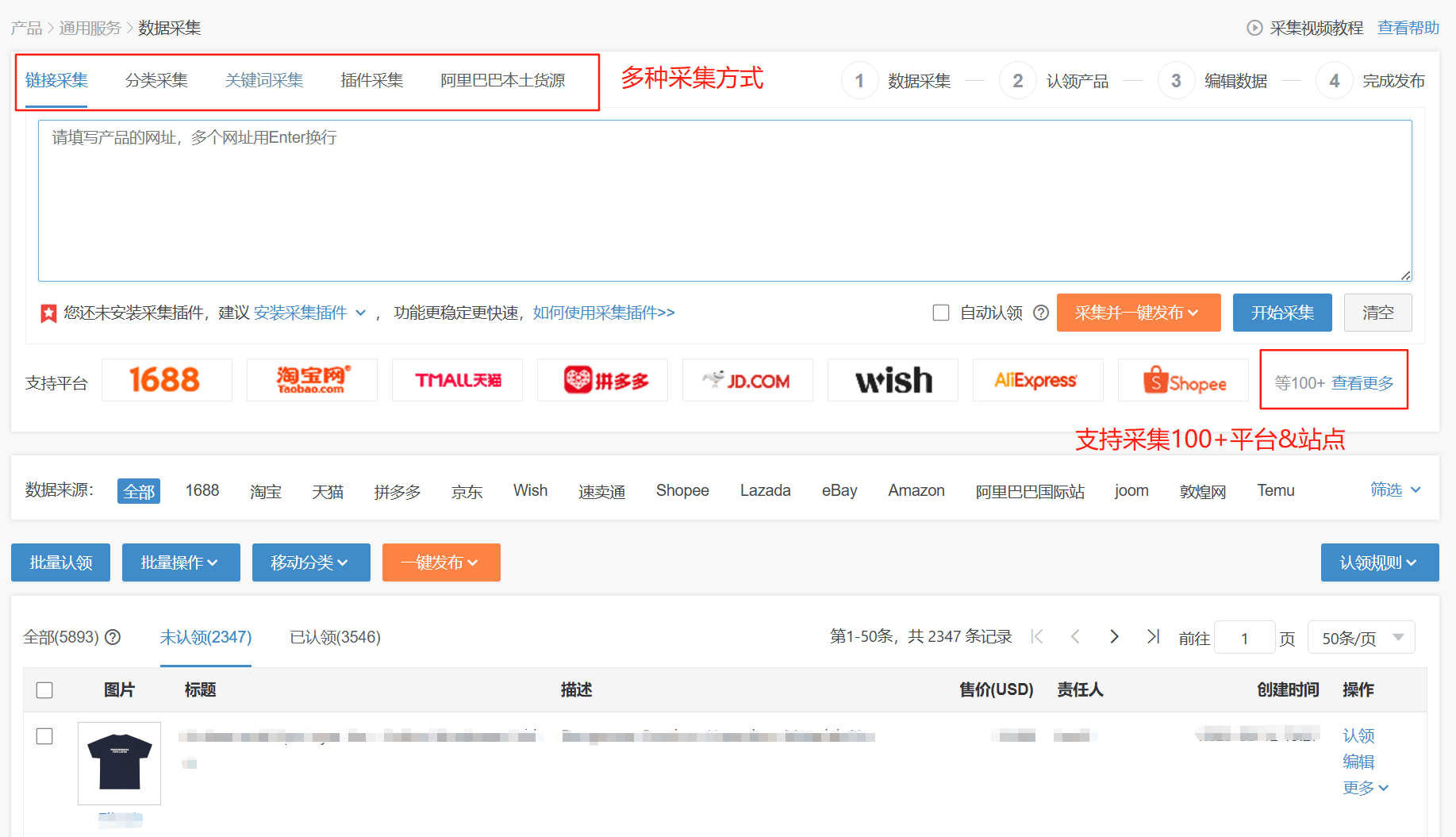 卖家可通过插件/关键词/链接等采集方式,快速将1688等100+平台&站点的商品批量采集至俄罗斯野莓Wildberries店铺,标题/描述/产品视频/变种属性/变种信息/图片信息等通通自动映射至店铺后台,发品效率大幅提升。