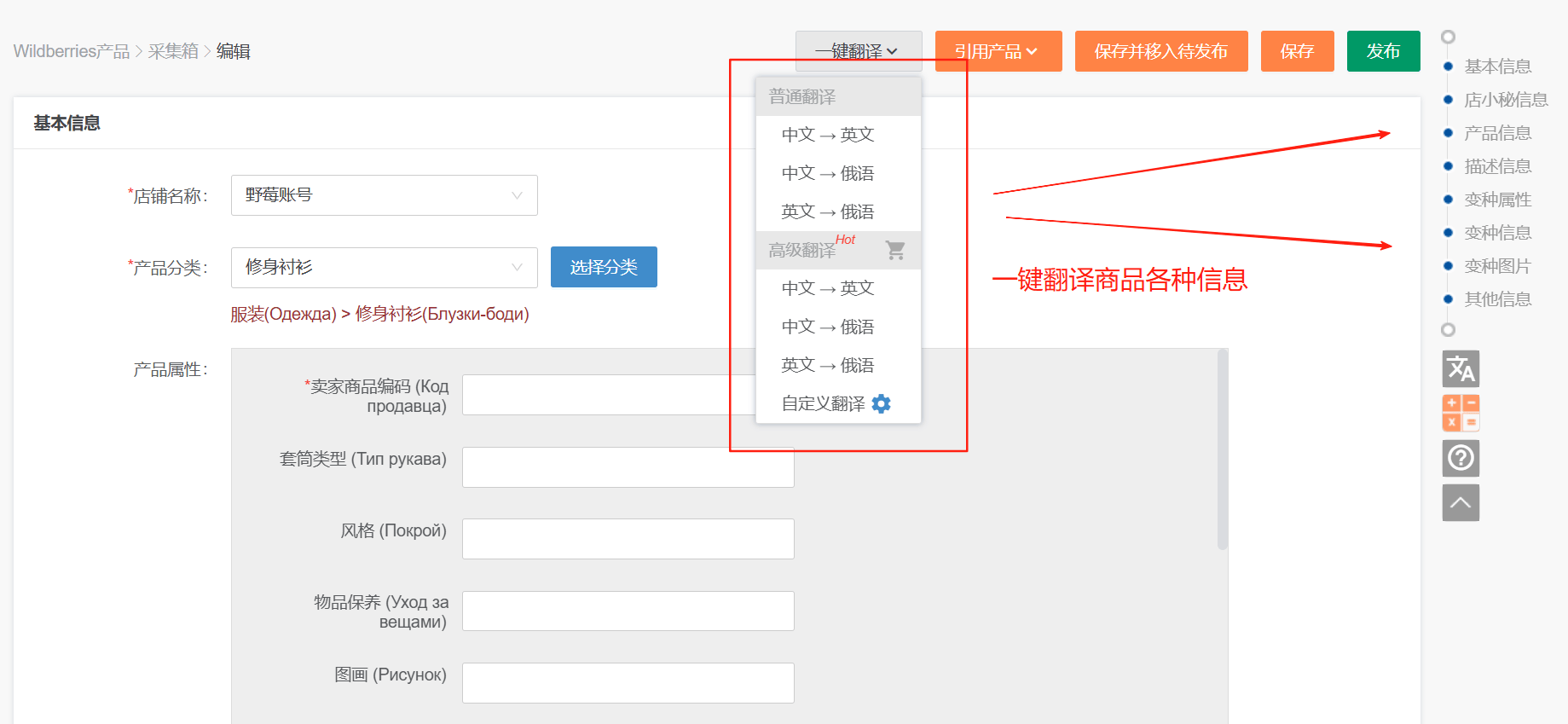 店小秘ERP还提供免费的中-俄翻译工具,卖家只需操作【一键翻译】,就能将标题/描述/变种属性/变种信息快速翻译成俄语。不仅如此,就连产品主图、详情页里的文字也支持翻译、编辑、调整,满足Wildberries本地化发品需求。