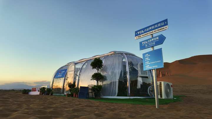 就在这样极端的沙漠环境里,TCL空调建了一座小蓝翼新风驿站,进行了“AI语音”、“AI睡眠”、“AI省电”、“高温制冷”四大极限挑战,诠释真正的“硬核实力”。