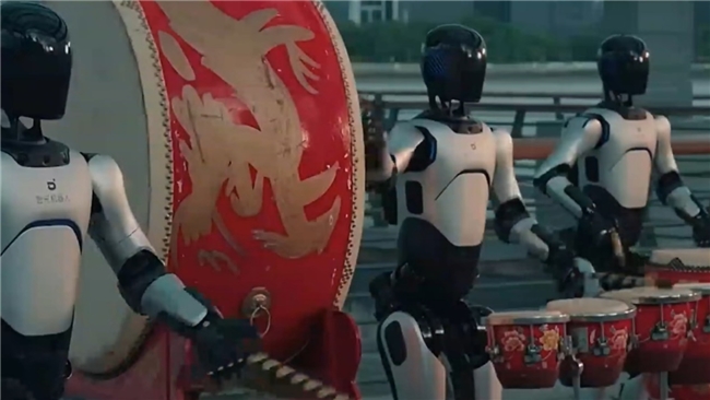从主持到表演,智元远征A2让科技与传统再次完成一场惊艳对话。在《迎客鼓》节目中,远征A2的身影与歌手阿朵、苗鼓十三姨形成奇妙的视觉交响。金属质感的机械臂扬起鼓槌,落向古朴苗鼓的瞬间,传统与现代的边界被悄然打破。鼓槌翻飞间,既有苗鼓十三调特有的韵律起伏,又带着机械运动独有的利落节奏,仿佛千年前的非遗技艺在此刻获得了科技赋予的新生命力。