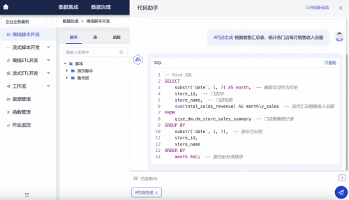基于深度语义理解技术解析业务意图,结合行业元数据和标准代码模版等行业知识,一键生成Hive/Python/Shell等全场景代码。其中行业知识包括:基于数百个数据治理项目经验,沉淀的应急、政务、零售等行业元数据,以及内置全删全插、动态分区初始化、增量比对追加、全量比对追加等9类高频数据开发代码模版,确保自动生成的代码更精准。