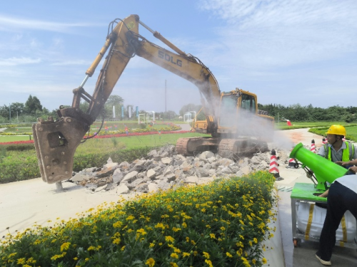 华西悦湖配套道路项目针对线性工程施工点位分散的痛点,创新采用“以动制散”的移动式降尘方案。以可随作业面同步移动的雾炮机组替代固定喷淋系统,既通过精准覆盖提升抑尘效率,又避免了固定设备空转造成的能源损耗,在减少粉尘污染的同时降低能耗成本,实现环保与节能的协同增效。
