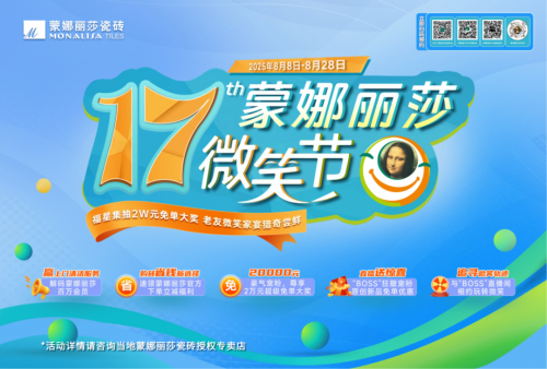 参与方式:8月8日起,全国3000 +蒙娜丽莎瓷砖门店及京东/天猫/抖音官方旗舰店同步开启活动,搜索“蒙娜丽莎微笑节”即可解锁专属福利,让我们一起,用微笑点亮美好家!