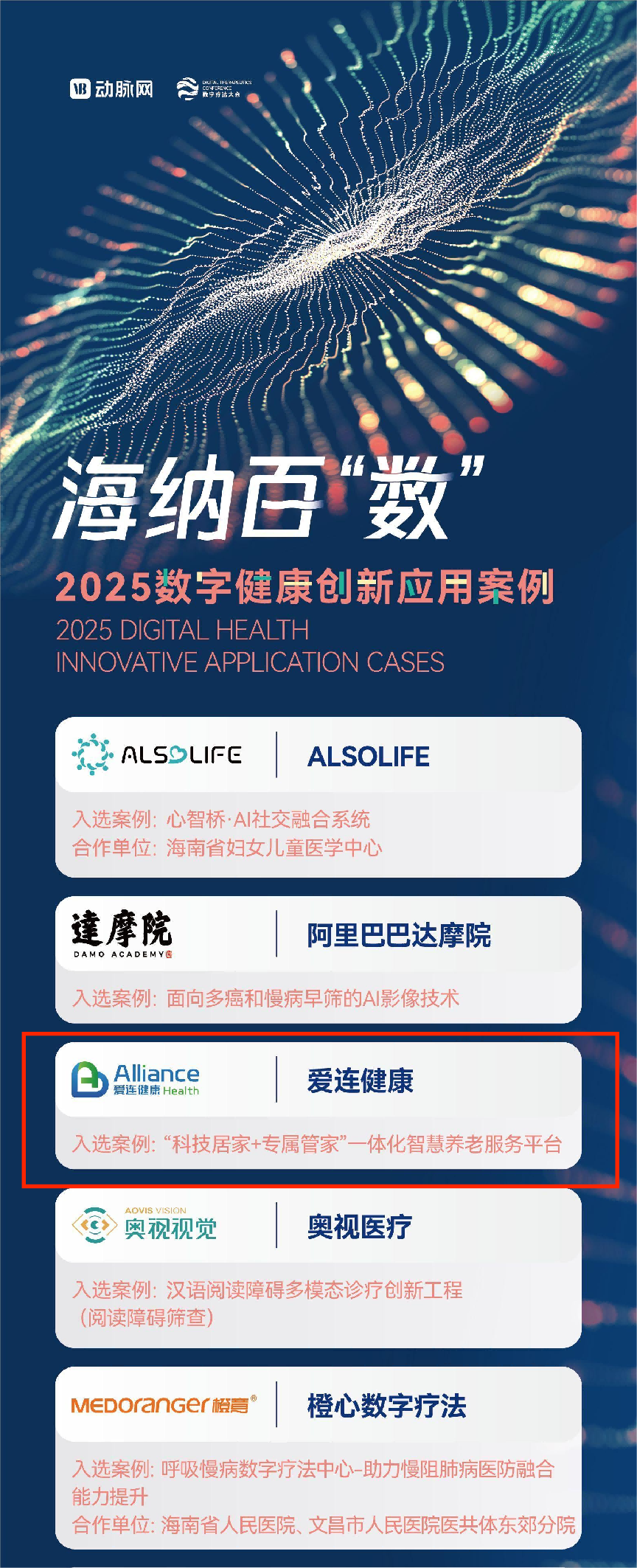 本次大会,动脉网正式发布了 “海纳百‘数’2025 数字健康创新应用案例” 评选结果,组委会围绕案例创新性、案例实用性、案例推广价值及影响力四大核心维度,对参选的200+案例展开创新应用价值评估,评选出25个获奖案例。爱连健康智慧养老服务平台基于“管家服务平台+科技助老平台+管家服务平台”三位一体的核心优势成功上榜,体现出在数字健康与智慧养老领域的行业认可度及影响力。