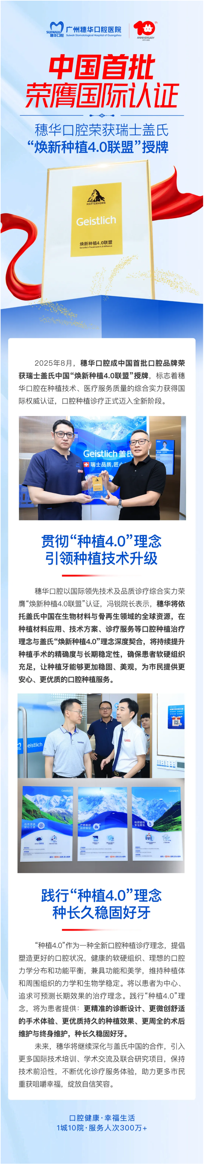 2025 年 8 月,穗华口腔成中国首批口腔品牌荣获瑞士盖氏中国 “焕新种植 4.0 联盟” 授牌,标志着穗华口腔在种植技术、医疗服务质量的综合实力获得国际权威认证,口腔种植诊疗正式迈入全新阶段。