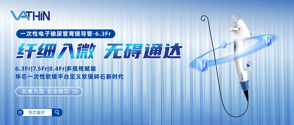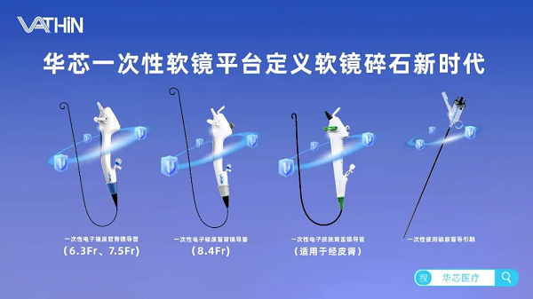 目前,泌尿领域是一次性内镜最成熟的应用领域,创新成果也最为集中。以华芯医疗一次性电子输尿管软镜为例,华芯一次性电子输尿管肾镜导管具有多种规格(6.3Fr,7.5Fr,8.4Fr), 结合华芯一次性使用输尿管导引鞘,真正实现了边碎石,边排石的效果,为碎石诊疗提供更全面的一站式解决方案。