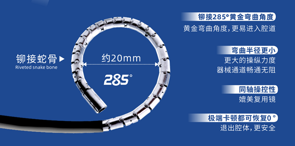 在安全性上,华芯医疗团队历经近二十年的研究,将原本应用在高端复式内镜上的铆接蛇骨设计,应用于一次性内窥镜之上,解决了市面上普遍使用的一体式切割成型蛇骨或一体式注塑蛇骨存在的易变形、寿命短的问题,避免内镜折断脱落造成的医疗事故。
