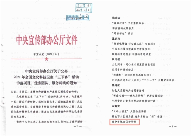 · “云南青少年视力保护计划”被中宣部办公厅评为“2021年全国文化科技卫生‘三下乡’活动示范项目”。
