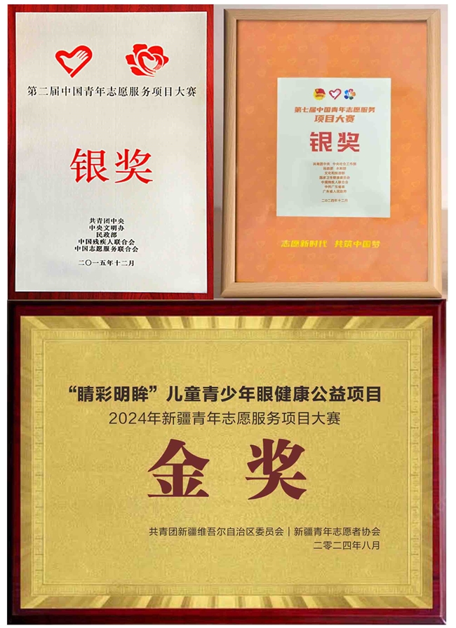 · 乌鲁木齐普瑞眼科“明眸”项目先后获得“2015年团中央志愿服务项目大赛银奖”、“2024年新疆志愿服务项目大赛金奖”和“2024年团中央志愿服务项目大赛银奖”。