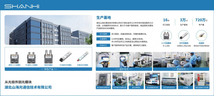 湖北山海光通信技术有限公司(简称:山海通信)是一家通信领域集产品研发制造生产于一体的高科技公司,专注于光模块、光组件的研发和生产。生产基地占地面积约30000㎡,拥有200多台生产和检测设备,年产量720万只。拥有现代化的生产基地和先进的生产设备,依托其得天独厚的地理位置和资源优势,致力于为客户提供高效、高品质的光模块产品和OEM服务。