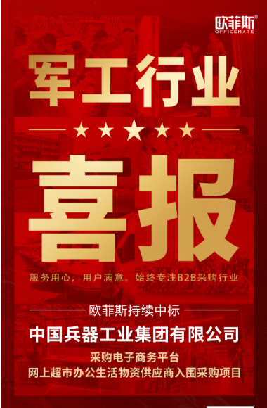 近日,欧菲斯集团股份有限公司凭借在B2B政企采购领域的综合实力,成功中标中国兵器工业集团有限公司采购电子商务平台网上超市办公生活物资供应商入围采购项目,此次中标是中国兵器工业集团对欧菲斯在B2B政企采购领域积累的服务经验与实践能力的高度认可。