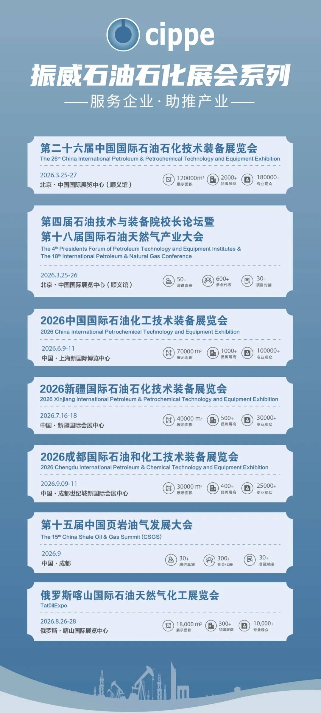 立足新的历史起点,cippe 成都石油展将始终与全球油气企业并肩同行、携手共进,在行业发展浪潮中行稳致远。作为系列展会矩阵,cippe 振威国际石油石化系列展会将永葆奋斗韧劲,以专业为基、以创新为翼,持续提升展会的专业深度与全球影响力,秉持 “时时有创造、处处求精进” 的理念,为我国油气产业高质量发展注入持久动能。