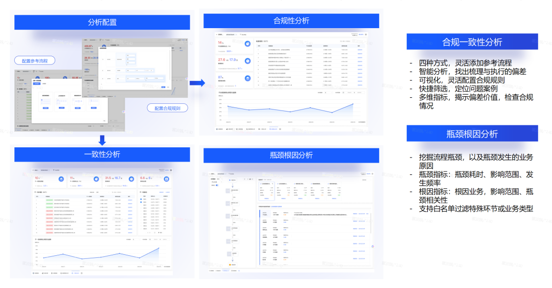 「AWS PMI流程挖掘洞察」通过瓶颈根因分析、合规性分析和一致性分析能力进行流程端到端场景分析,基于算法识别影响流程运行的关键变量,为绩效改进提供科学依据。