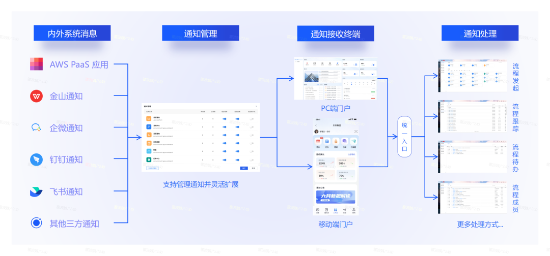 ·在执行层面,统一流程中心承接对外接口,并进行场景分类,逐步把散落在各系统的流程汇聚一处,形成“端到端”场景。