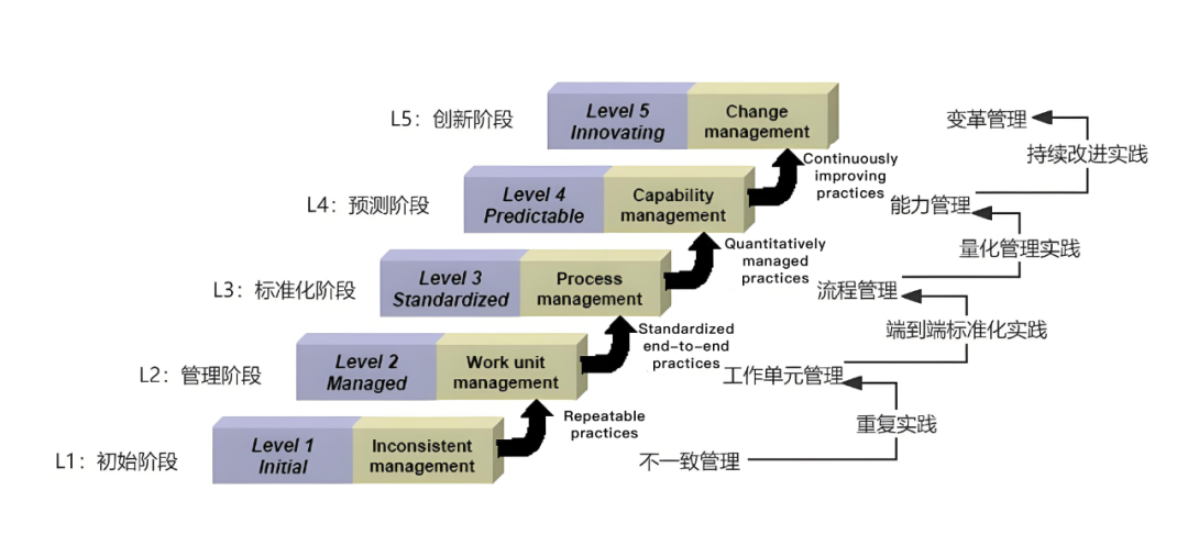 ·L5创新阶段:在这⼀阶段,组织致力于持续改进其业务流程、产品和服务。他们通过预防缺陷和问题、持续提升自身能力以及进行结构性(即有计划的)创新来实现这⼀目标。
