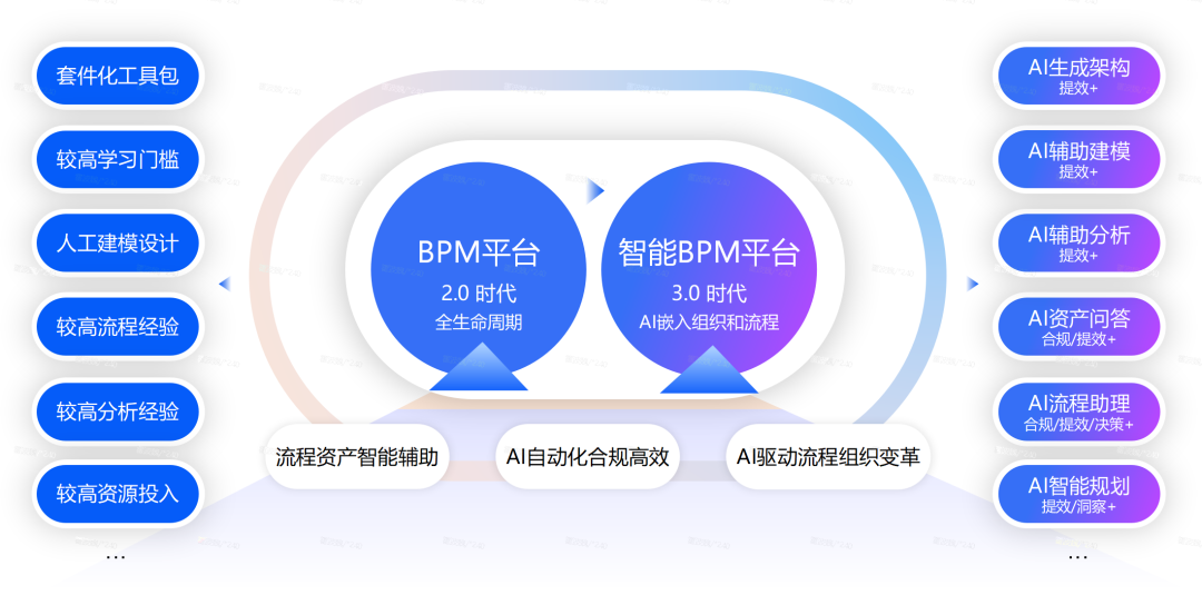 这一阶段的核心转变在于,企业不再依赖人工经验和静态规则,而是充分利用新技术推动流程的自适应与前瞻性优化。AI技术正成为这一阶段的核心引擎,使流程管理进入智能BPM时代,在这一时代中: