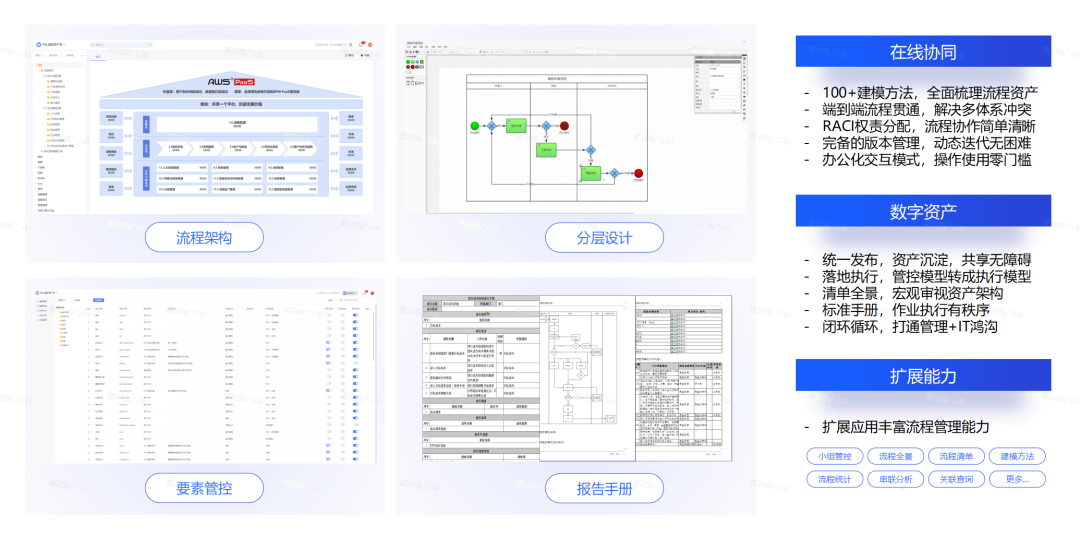「AWS PAL流程资产库」能够支持多种标准架构建模,满足不同企业的管理诉求;同时具备流程要素建模、关联关系管理能力,能够很好的支撑流程分层分级管理、要素信息孤岛打通。