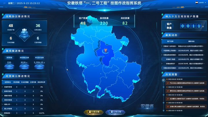大会现场,安徽铁塔重磅上线“一二号工程”挂图作战指挥系统与区域营销助手软件两款全新工具,为区域发展注入科技动能。其中,“一二号工程”挂图作战指挥系统堪称政企协同的“智能中枢”,不仅能实时同步省级合作动态、整合县域商机库,更能打通“协议签约-建设推进-回款跟踪”全流程闭环,实现项目“一图统览、一网统管、一键统调”,从根源上破解县域市场信息分散、协同效率低的痛点。