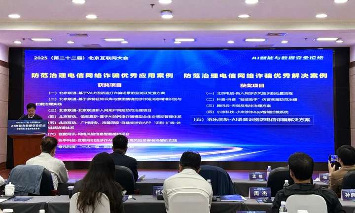 9月25日,以“数智共生 安全护航未来”为主题的2025北京互联网大会“AI赋能与数据安全论坛”在京成功举办。论坛汇聚了政企学研各方专家,共同探讨反诈治理新路径。会中,北京市通信管理局二级巡视员孙立新宣布 “网络与数据安全、防范治理电信网络诈骗典型案例”名单,羽乐科技凭借深厚的 AI 反诈技术积淀与全链路生态构建成果成功入选,与移动、联通、电信、腾讯、小米、抖音、快手等公司共同展示了通信安全领域的前沿成果。