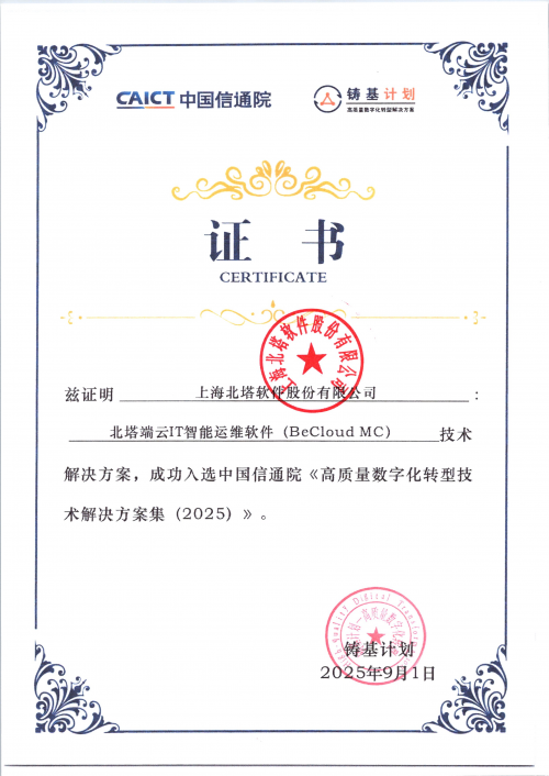 近日,上海北塔软件股份有限公司旗下核心产品——北塔端云IT智能运维软件(BeCloud MC)凭借其在数字化转型领域的卓越技术实力与广泛应用价值,成功入选中国信通院“铸基计划”《高质量数字化转型产品及服务全景图(2025)》与《高质量数字化转型技术解决方案集(2025)》,一次性斩获两项重磅权威认证。