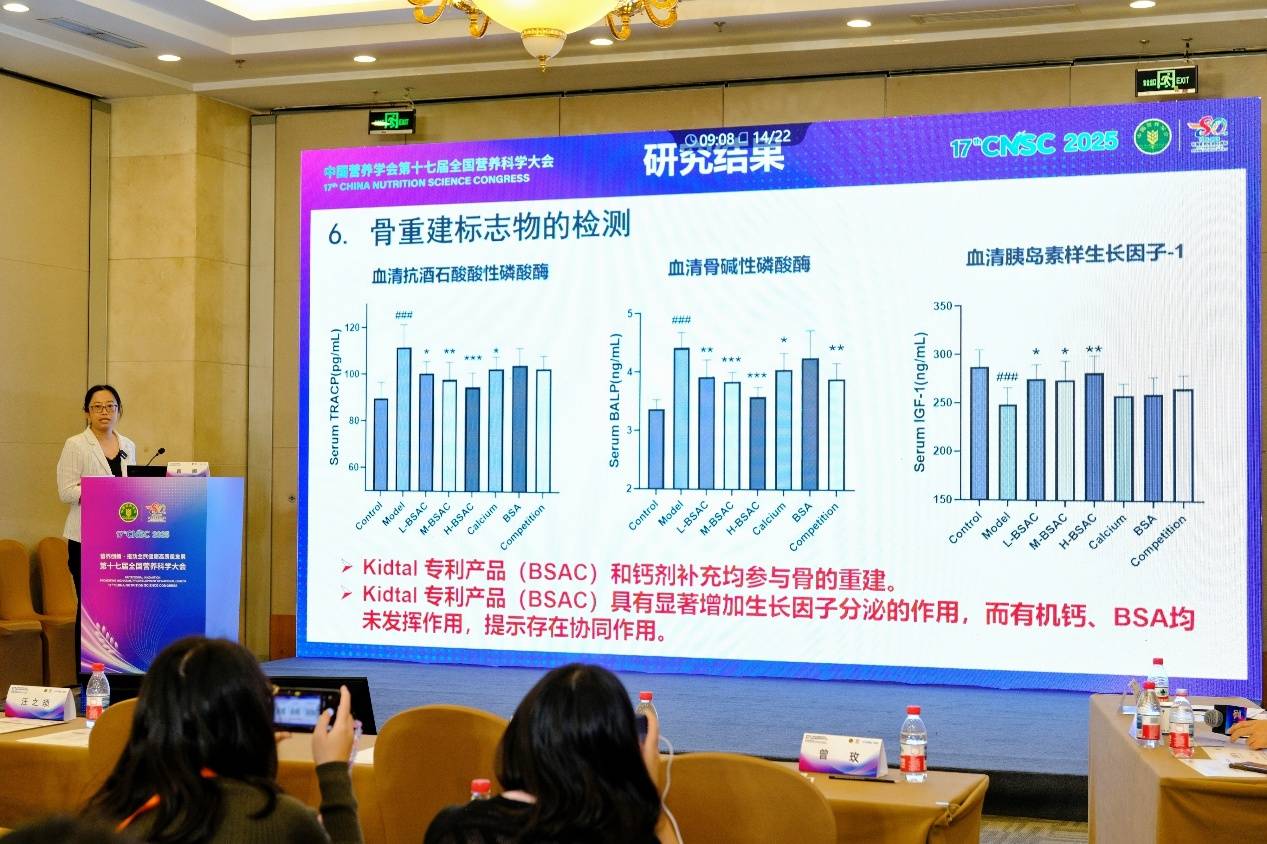 韩娜教授在发言中指出,儿童生长迟缓除了遗传及疾病等不可控因素外,更多源自营养不良、运动不足和睡眠不足等复合原因。在这一背景下,单一钙剂的补充效果往往有限,而多营养成分的协同补充能带来更显著的效果。团队通过动物模型实验验证发现,与等剂量单一有机钙补充相比,Kidtal®配方能更有效地促进生长因子分泌与生长板发育。