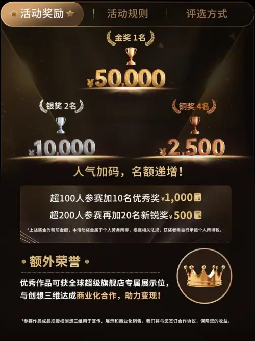 奖项设置:金奖1名可获5万元现金,银奖2名各获1万元,铜奖4名各获2500元,优秀作品还可获全球超级旗舰店专属展示位,官方助你创意变现!