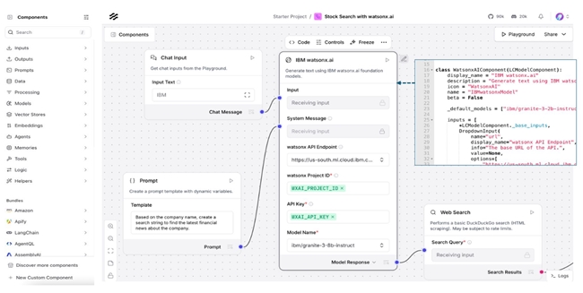 · Langflow 与 watsonx Orchestrate 的集成使开发人员能够使用拖放式的可视化构建器来构建智能体和流程。