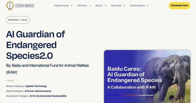 当地时间10月16日,第25届爱护动物行动奖(Animal Action Award)活动现场,百度凭借“濒危物种AI守护官2.0”项目获得年度创新实践奖(Innovator of the Year Award)。该奖项用于表彰在动物保护和福利领域,通过创新技术和解决方案取得卓越成效的先锋行动者。