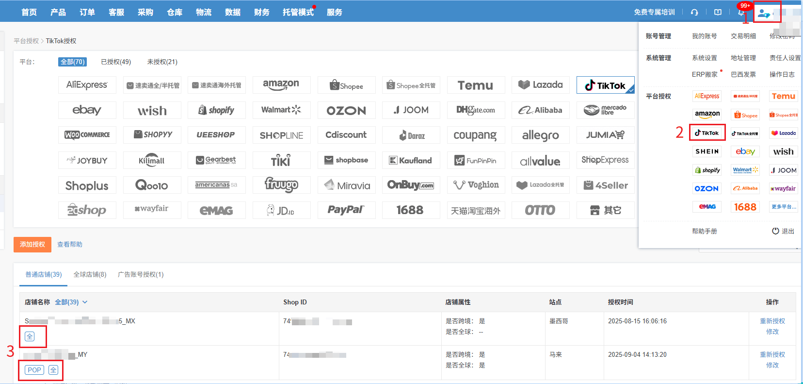登陆店小秘ERP>用户中心>平台授权>TikTok,根据标识查看店铺升级情况:带【POP】标识:支持使用POP新版发品模式