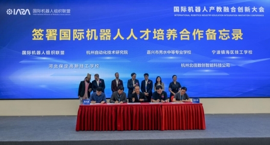 活动现场签署了《国际机器人人才培养合作备忘录》,国际机器人组织联盟、杭州自动化技术研究院与多家高校和企业共同签署合作文件,标志着产学研多方代表将深度探索企业高校联合培养创新人才的新机制,携手构建一个开放、协同的国际机器人人才发展创新生态。