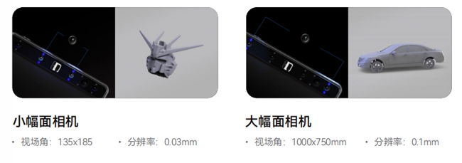 双模组镜头,大幅面扫描+小幅面精细扫描一键切换在扫描镜头配置方面,Toucan配置了大幅面跟小幅面的双镜头模组,其中,小幅面视场角为135x185mm,能够精准捕获其细节;大幅面视场角为1000x750mm,可以扫描物体的大轮廓范围。两种幅面可以自由切换,无论是小微物体,还是大型物体,Toucan都能轻松hold住。