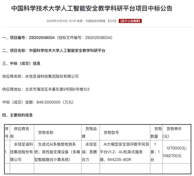 欣闻捷报!永信至诚成功中标中国科学技术大学“人工智能安全教学科研平台”项目。这一合作标志着永信至诚在人工智能教学与科研平台建设方面的技术实力与实践成果再获国内顶尖高校的认可,同时也为我国人工智能安全领域的高质量人才培养与科研创新注入新动能。