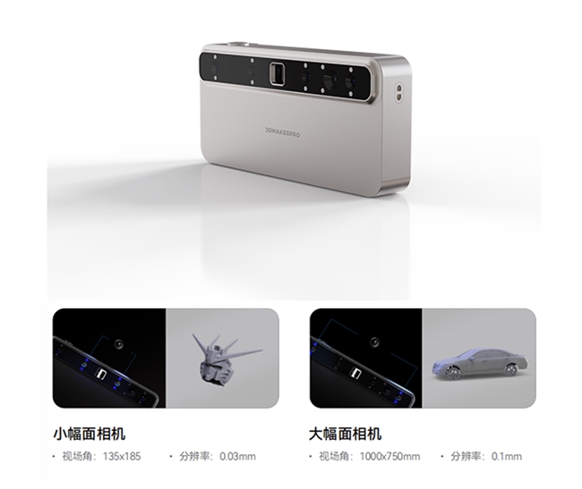 双模组设计,大小幅面自由切换,大中小型物品都可以扫Toucan无线一体机采用的是大小幅面双镜头模组,可以自由切换微距模组和大幅面模组。其中视场角为135x185mm的小幅面镜头能够精准捕获物体表面的细节,视场角为1000x750mm的大幅面镜头则可以快速捕获中大型物体表面。小到螺丝帽,大到汽车都能轻松扫描建模。