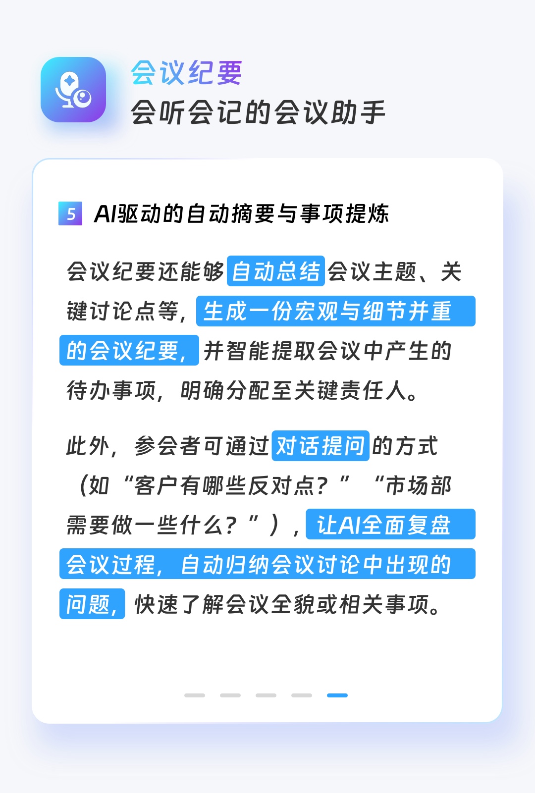 尤其在脑暴会、方案讨论会等观点交织的场景中,传统按时间线记录的方式难以捕捉核心观点与待办事项。而会议纪要基于声纹识别,充分利用热词(人名)与内部知识库等前置设置,强化AI的语义理解能力,让AI可以突破传统按时间线记录或理解会议,充分利用上下文,智能区分语境,解决会议中观点穿插、事项繁杂等痛点问题,最终自动生成结构化会议纪要和清晰待办清单,并通过简单的问答就可以获取会议全貌或关联的讨论内容,让会议有结果、更有成果。
