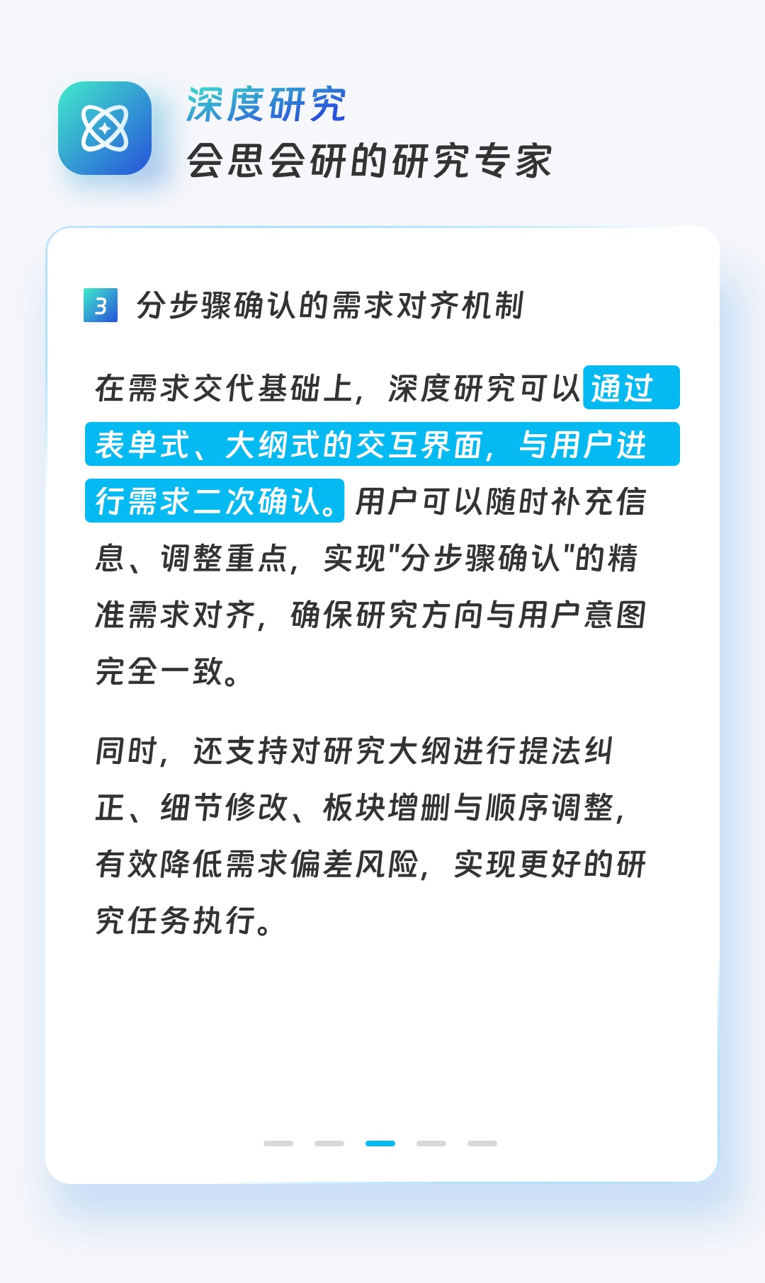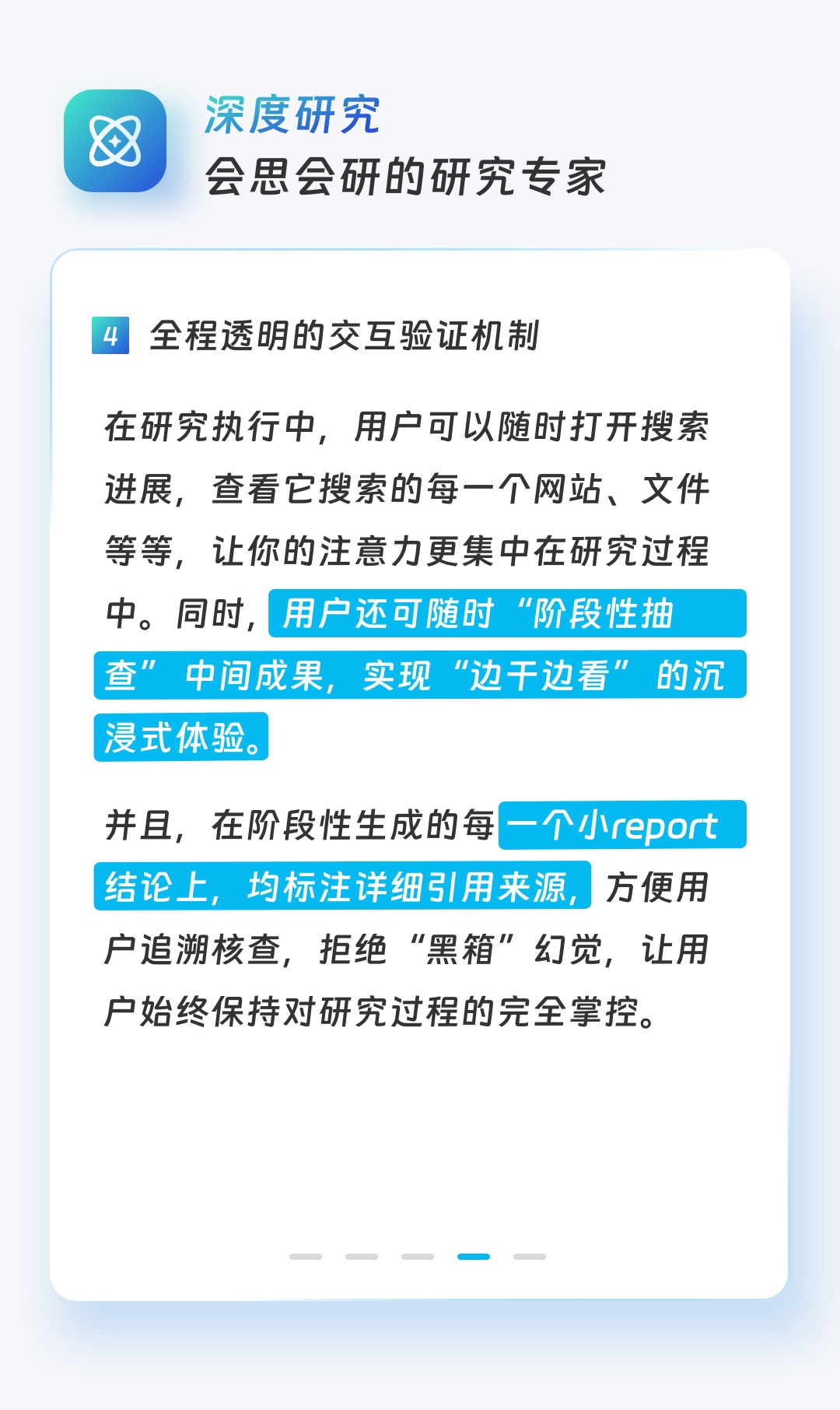 个知·智能工作站的深度研究将“深度思考”的能力与过程强化,能在10分钟读完十万字,并从拆解任务到分析总结以全过程呈现的方式,在用户面前输出一份一万字的观点清晰、框架简洁的专业报告。由此将AI在研究场景中的价值,提升为一份可以深度学习、细细审计的“研究成果”。尤为重要的是,通过填写表单式的二次需求确认以及实时可查看的搜索内容与阶段性处理进程,实现"边看边干"的沉浸式研究体验。这不仅让用户从繁琐的信息筛选中解脱,还能帮助用户是利用AI拓宽信息边界,构建起全面的知识图谱,交付一份有框架、有内容、有观点的专业成果。