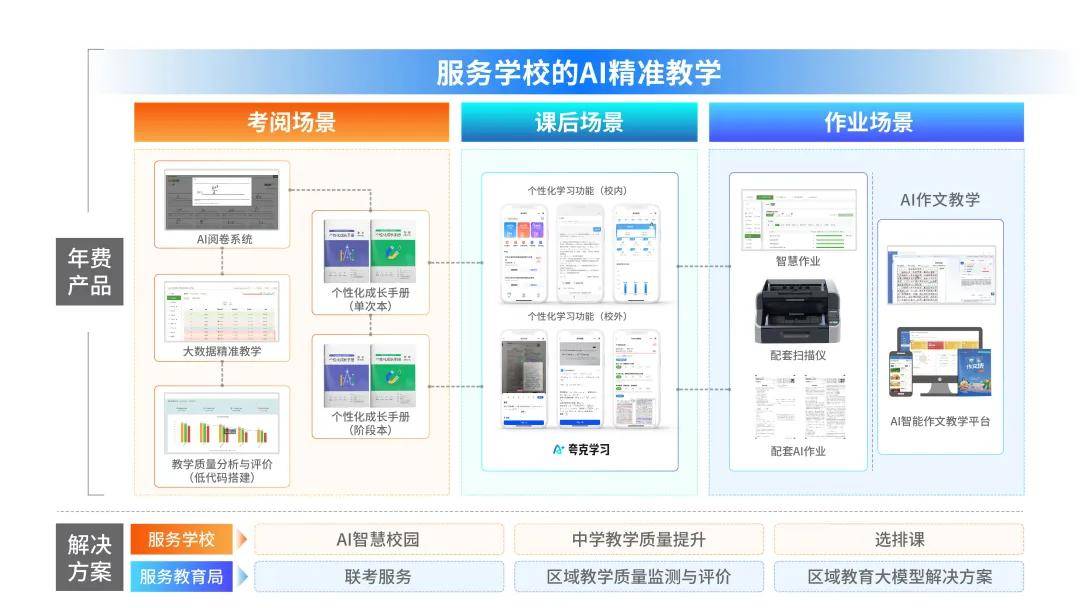 4大精准教学产品线:智能阅卷、个性化成长手册、AI作文教学、智慧作业;