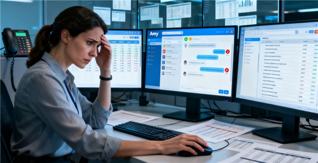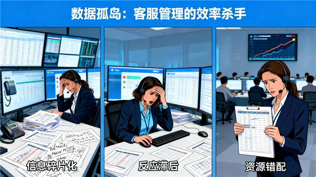 Amy立即打开传统的客服管理系统,却发现数据分散在不同的平台:电话数据在一个系统,在线咨询在另一个平台,邮件客服又是独立运作。她需要同时查看三个不同的界面,才能对整个客服状况有个大致了解。