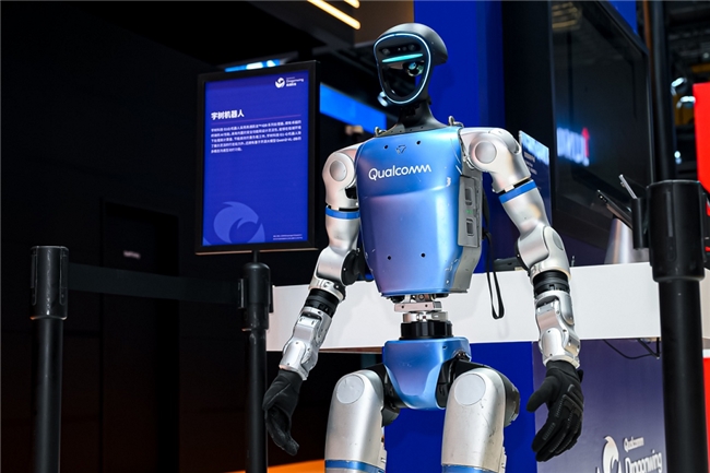 不仅是智能体AI,具身智能在今年首次被写入《政府工作报告》,也备受关注。而人形机器人正是具身智能最理想的载体之一。在高通展台上,宇树人型机器人成为一大亮点。这款机器人采用高通跃龙IQ9系列处理器,拥有出色的终端侧 AI性能,具有内置的安全功能和设计灵活性,能够在极端环境下处理高计算量、节能高效的重负载工作。除了灵活的行走能力,这款机器人还拥有基于开源大模型Qwen2-VL-2B的多模态沟通互动的功能,深受现场观众喜爱。