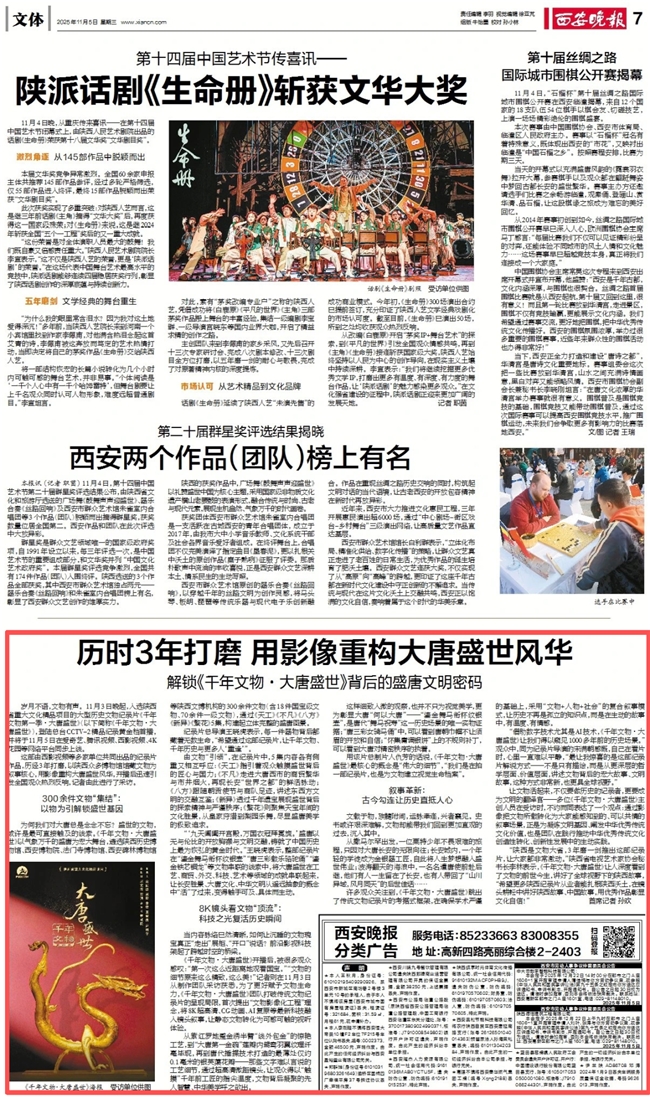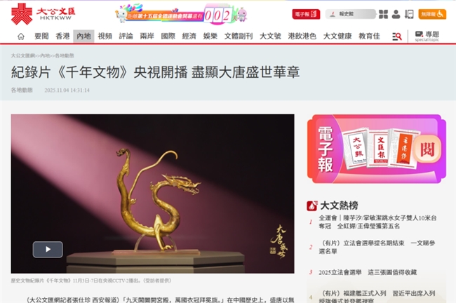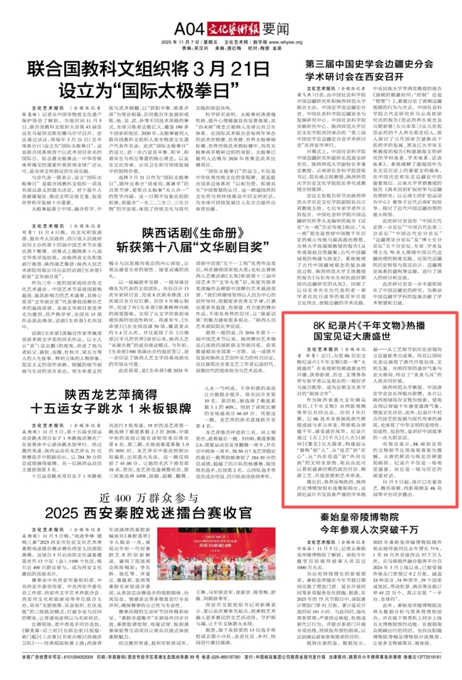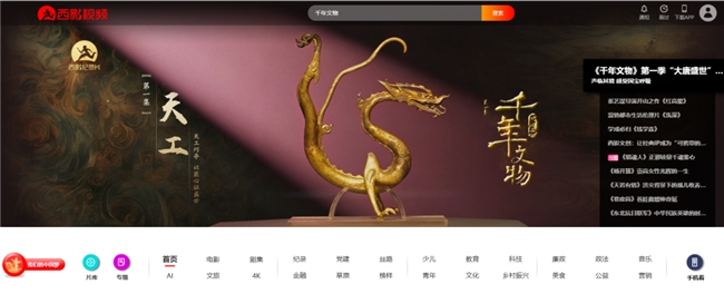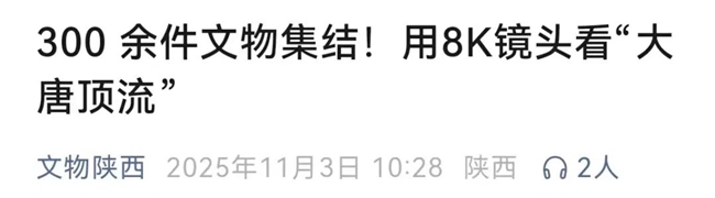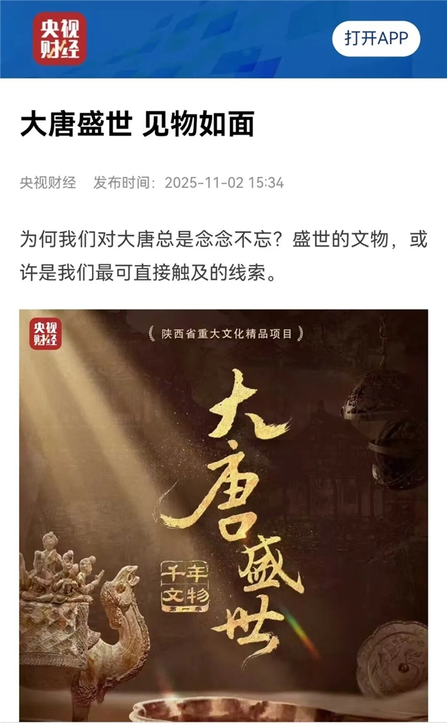 《千年文物·大唐盛世》致力于构建“纪录片+”文化新生态,以“数字互动—线下体验—社交传播”的闭环模式,为传统文化传播提供了“活化”样本,也为文博领域的创新发展探索出可复制的实践路径。目前,该纪录片已登陆爱奇艺、腾讯视频、西影视频、4K花园等网络平台,继续带您沉浸感受开放包容、气象万千的大唐盛世。